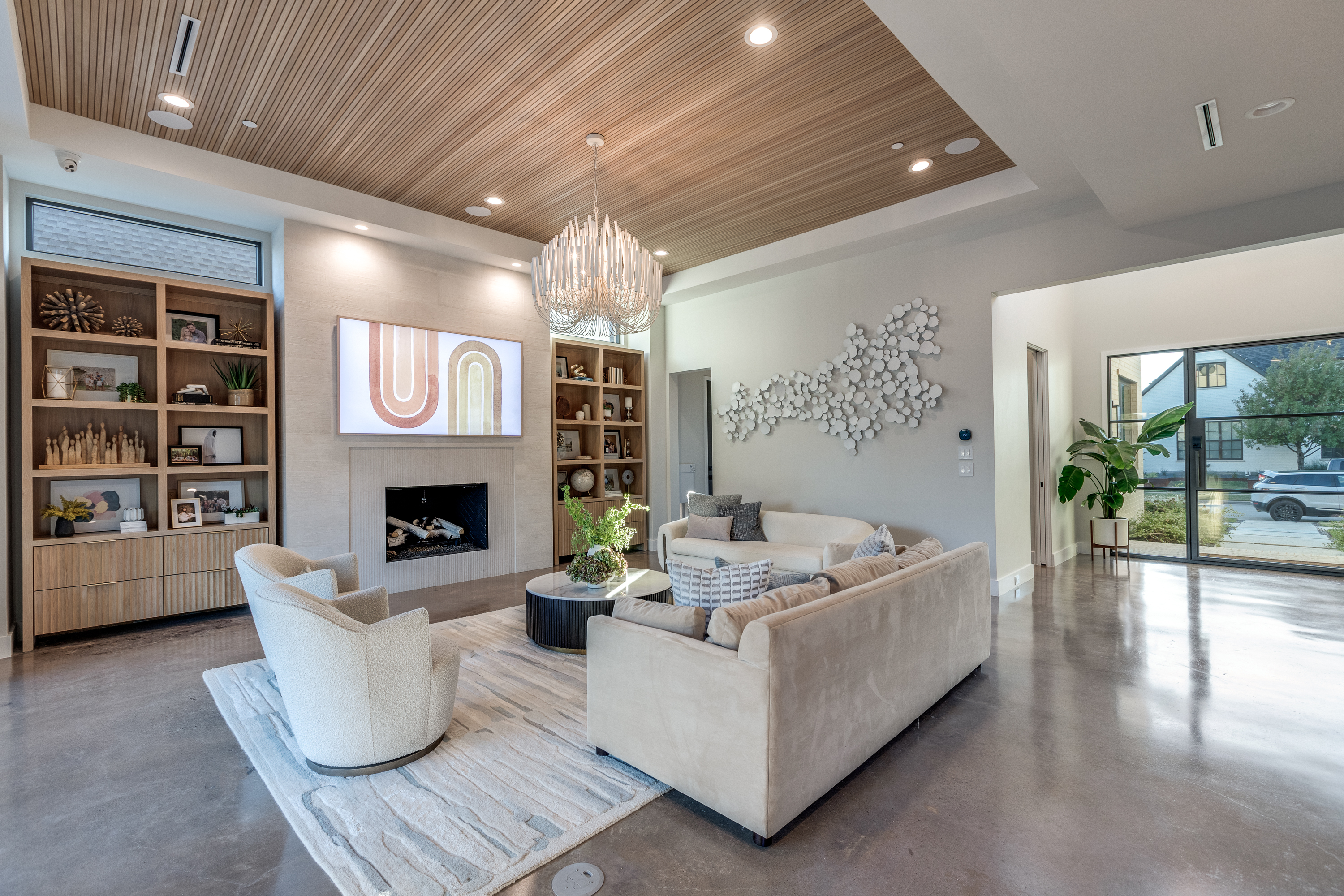 At the center of the home is a spacious open-concept living room. The room’s detailed ceiling and gorgeous light fixture create a sense of sophistication, while a floor-to-ceiling stone gas fireplace brings warmth and a natural focal point.