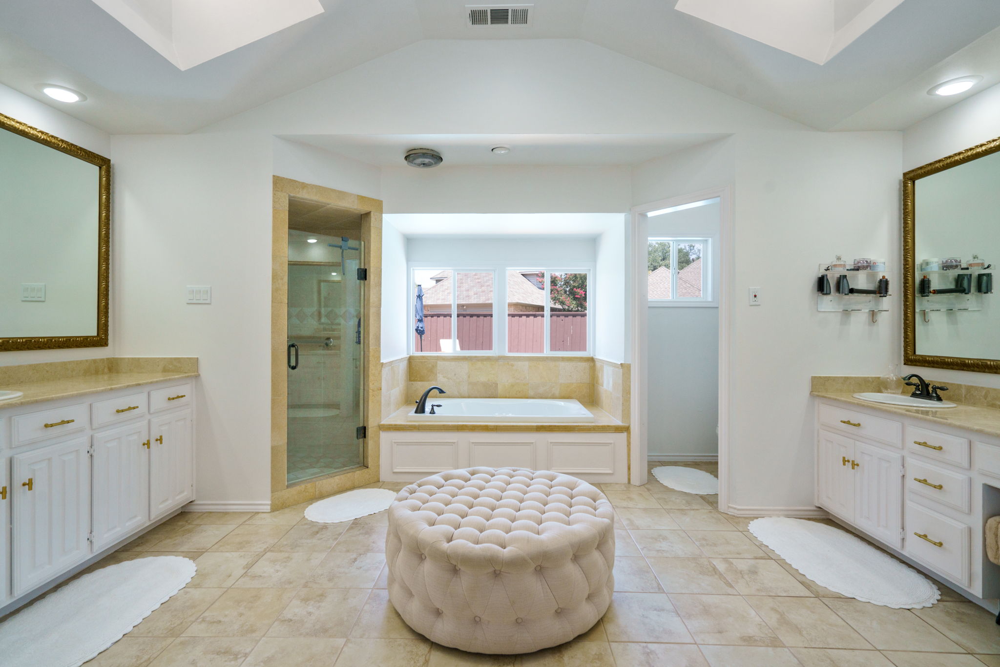 Toward the back of the home, you’ll find the primary suite. This spacious retreat has hardwood floors and offers ample space for a king-sized bed and additional furniture, but the real star is the ensuite bath. Updates include new plumbing, and the layout is designed with comfort in mind: a large soaking tub with a view of the pool, separate shower, dual vanities, and his-and-hers closets. It’s a private space where you can truly unwind.
