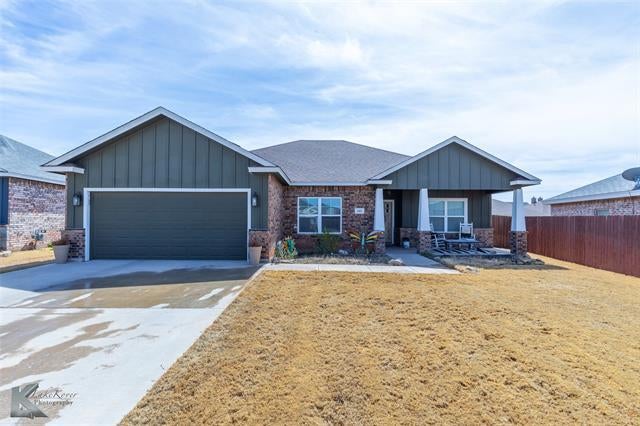This charming home features a cute covered front porch and a spacious, open floor plan with 3 bedrooms and 2 full bathrooms. The cozy living room boasts a wood-burning brick fireplace and provides easy access to the back patio. The kitchen is a standout with stainless steel appliances, a breakfast bar, and beautiful granite countertops. The guest rooms are nicely sized, while the primary suite is perfect for relaxation, offering an ensuite bathroom with dual sinks, a large vanity with ample storage, and a walk-in tiled shower. Outside, enjoy the large, covered back patio and fully fenced yard, perfect for entertaining or relaxing.