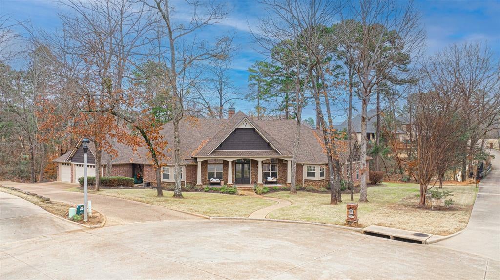 The primary suite is a true retreat, with French doors opening to the back patio. Inside, a double-sided fireplace adds warmth and ambiance, while the spa-like bathroom features a multi-head shower, oversized bench, separate vanities, and walk-in closets.