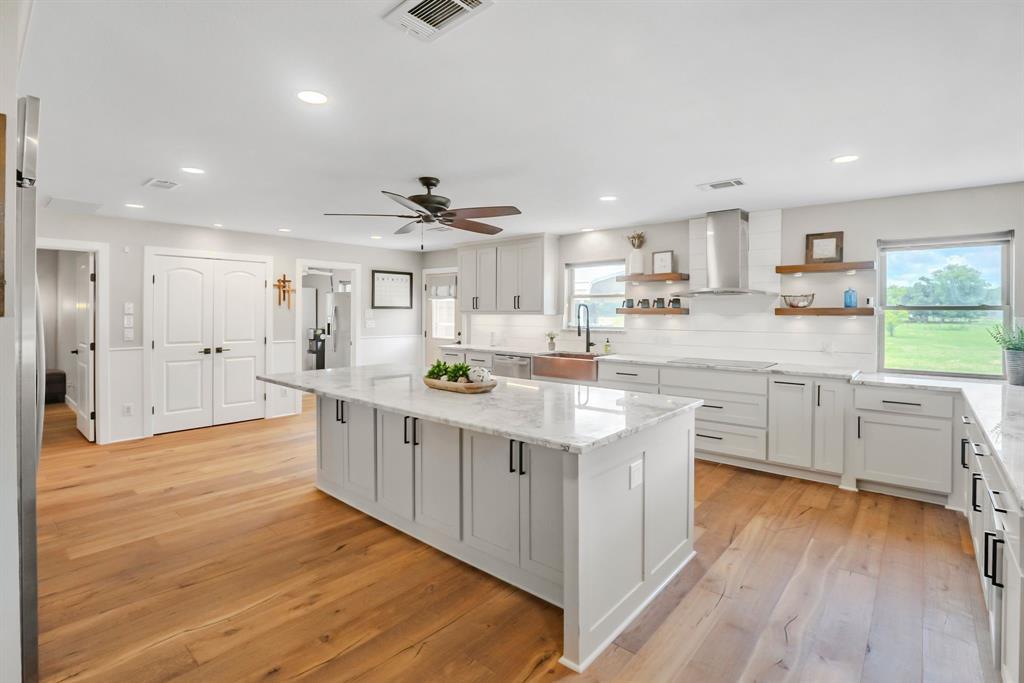This stunning custom-built and recently remodeled home in Point, Texas offers an incredible opportunity to embrace luxurious country living. Nestled on 11.76 acres, this 2,700 sq. ft. estate perfectly combines modern elegance with smart home technology. From the moment you step inside, you'll be greeted by the warmth of gorgeous white oak hardwood flooring. The open-concept gourmet kitchen is truly a highlight, featuring a large island, Microwave-oven combo, wine cooler, built-in commercial refrigerator, custom cabinetry, and sleek Dolomite stone countertops – an ideal space for both entertaining and everyday life. The adjacent family room offers a custom-built entertainment center and ample storage, while a Nest thermostat provides convenient climate control. You'll also appreciate the stylish and efficient new plumbing fixtures throughout the home. The thoughtful layout includes a primary suite and an additional bedroom on the main floor, along with a full bath. Upstairs, you'll find two more bedrooms, a full bathroom, and a breathtaking custom-designed study, perfect for working from home or relaxing. The home also boasts a durable metal roof and energy-efficient spray foam insulation. The property is fully fenced and features a charming pond. Additionally, there's a spacious 30x40 insulated shop with a half bath, tankless water heater, and a big solar panel system (fully owned), offering a fantastic eco-friendly workspace. Covered parking and storage are abundant with a 20-ft overhang and a 25x60 open attached awning. This exceptional property truly offers the perfect blend of contemporary comfort and peaceful rural living. It's an ideal investment for those seeking luxury, privacy, and functionality.