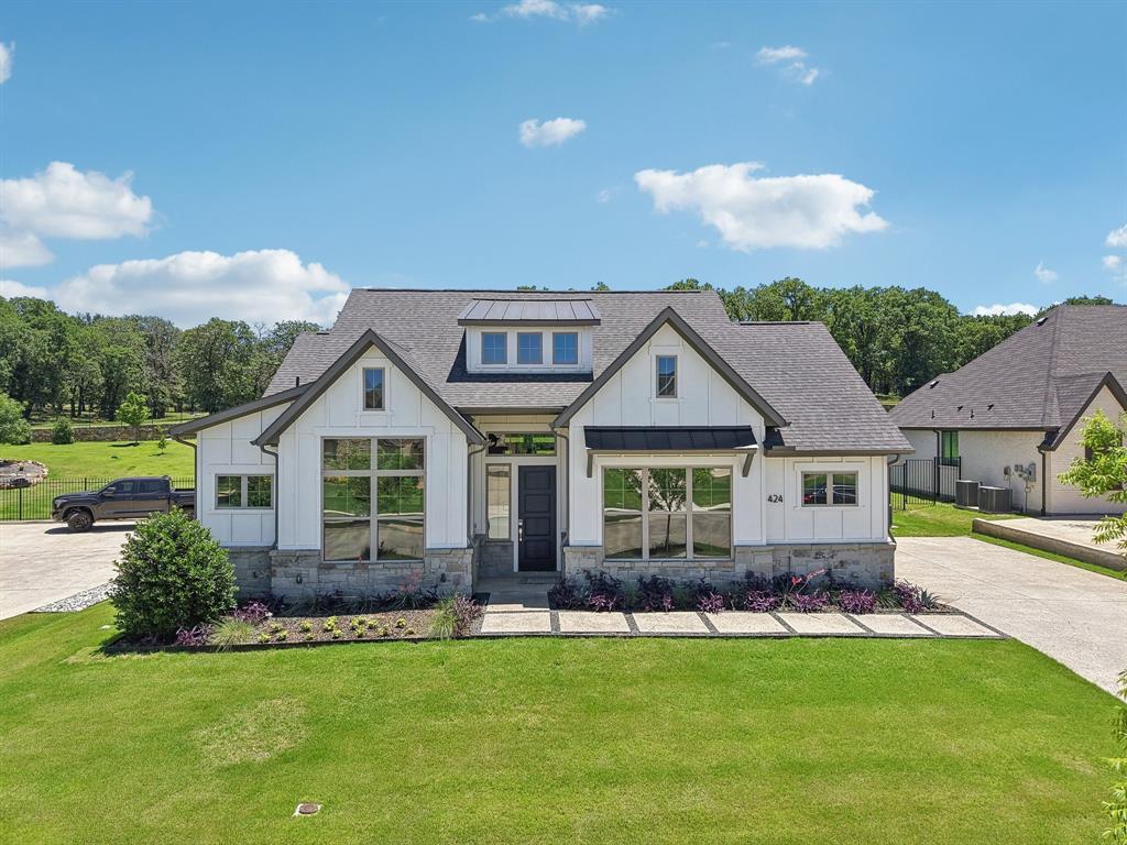 Seller offering $5,000 in concessions in addition to $4,000 in lender incentives! Don't miss your chance to own the ONLY single-story home with a view for sale in 5T Ranch. This exceptional 4-bed, 3.5 bath home blends modern luxury with close-knit community and it's tucked away on a premium oversized lot with a tree-filled view. It's also zoned to Hilltop Elementary in the top-rated Argyle ISD! Step inside to warm wood flooring, high ceilings, & sun-drenched living spaces. The expansive kitchen is a chef’s dream, with stainless steel appliances, a gas cooktop, double ovens, quartz counters, an Instahot water dispenser, abundant cabinetry, & generous prep space—all overlooking the breakfast nook & spacious family room. It also has surround sound & a gas fireplace enhanced with a blower, but best of all a priceless view that will always remain! The primary suite is a luxurious retreat with cathedral ceilings, a spa bath, & an oversized custom walk-in closet featuring built-ins & a striking center island. Three additional bedrooms include two with walk-in closets & a thoughtfully positioned front mother-in-law suite offering ideal privacy. Plus, there is also a large front office. Outside, a beautifully designed extended patio with its own fireplace sets the stage for year-round outdoor living. Raised flower beds, enhanced drainage, professional outdoor lighting, & a sprinkler system complete the landscape. The home is also prewired for a future pool with two 240V & one 120V electrical leads in place. Additional features include money-saving solar panels, a 3-car garage with custom cabinetry & a workbench, an EV charging outlet, a fully decked attic with safety rails & an electric lift for effortless storage, & a professionally integrated Control4 system—providing seamless control of HVAC, audio-video, mesh Wi-Fi, & automated outdoor lighting. This home is positioned in one of Argyle’s most desired neighborhoods that includes a massive park & gorgeous walking trail.
