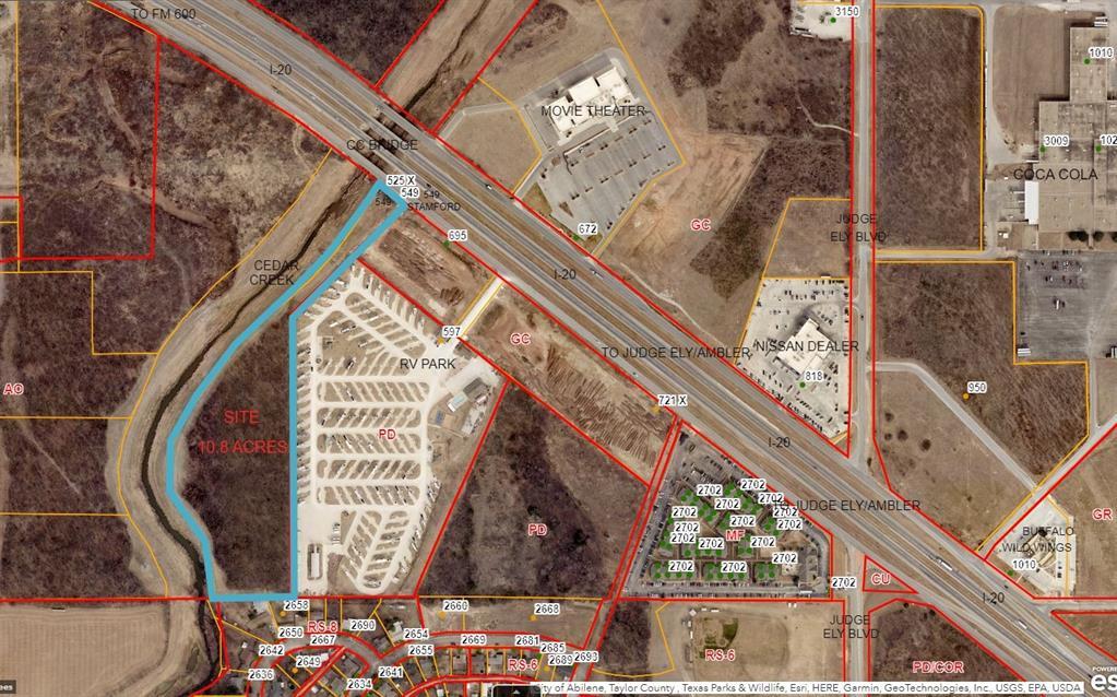 10.8 Acre Development Tract on Interstate 20 within minutes from ACU, Wal-Mart, Hardin Simmons, & Hendrick Medical Center. The property is currently zoned AO but The City has recommended GC zoning as well as Multi-Family but it could be any number of uses with the natural terrain & frontage on I-20 & Cedar Creek. 4.8 acres are out of the Floodway and can be developed with some flood consideration. A City of Abilene Sewer Line borders the entire length of the property along Cedar Creek with Water & Electric available also. Uses could include a Boat RV Storage facility, Self Storage Units, Office Warehouse Units, Apartments, Landscape Company, Motel, Church, Private Retreat. Besides a commercial business this could be a great location for Short Term Rental Units which could also accommodate horses & large trailers for Events at the Expo Center. See attached drawings and exhibits for this one of a kind opportunity in the heart of Abilene! Owner-Agent