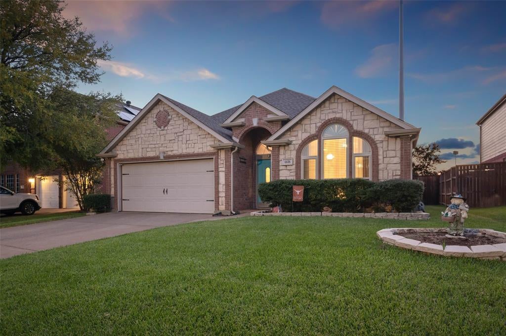 Welcome to this beautifully maintained East facing 4 bedroom, 2 bath, single story home offering 2,125 sq. ft. of comfortable living space. Featuring a desirable split bedroom layout and an open floor plan, this home is designed for both relaxation and entertaining. The kitchen is equipped with new appliances, granite countertops, a breakfast bar, and opens seamlessly to the living area, highlighted by tall ceilings and energy efficient 3 pane windows with warranty. Wood flooring, ceramic tile, and luxury vinyl plank add warmth and durability throughout. The spacious primary suite includes a fully updated ensuite bath with dual sinks, while the secondary bedrooms are privately tucked away. Major updates bring peace of mind with a newer roof in 2019, AC in 2019, water heater in 2022, and owned solar panels for energy efficiency. Enjoy evenings outdoors under the covered patio, surrounded by a private backyard retreat with two sheds. Conveniently located near FM 2499, minutes from I-35, and close to Denton, Highland Village, and highly rated Guyer High School. This move in ready home combines modern updates, prime location, and lasting value. Oakmont POA includes a social membership to Oakmont Country Club.