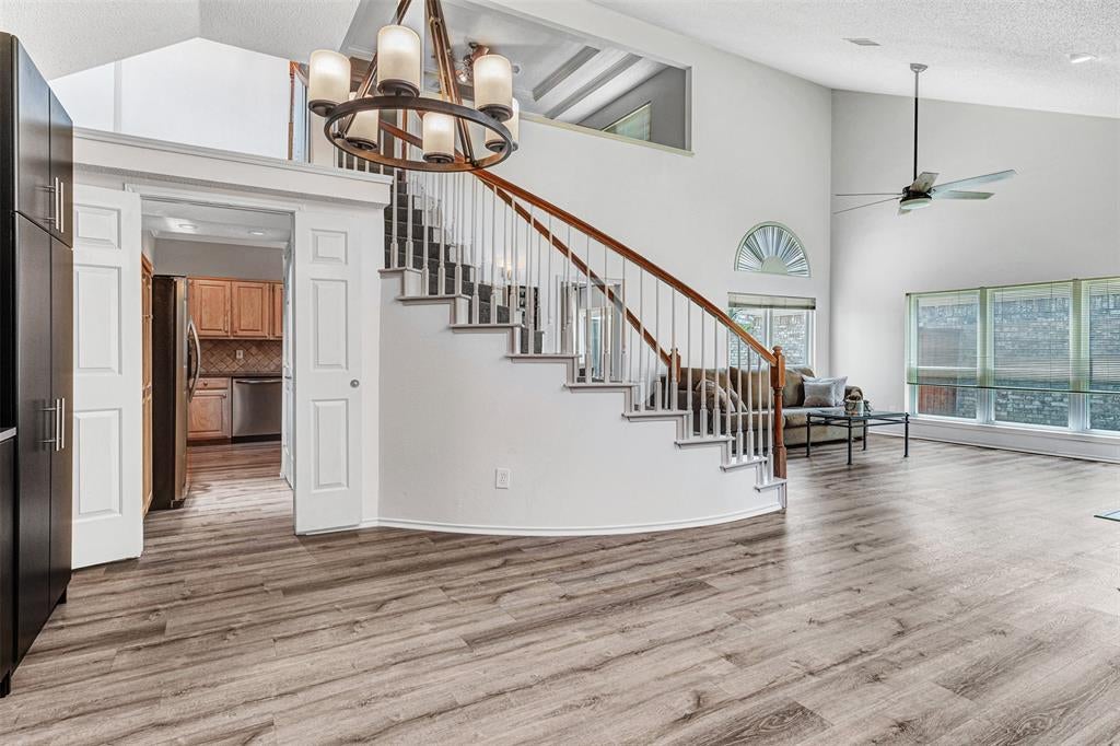 Beautifully updated and move-in ready home in Richardson, zoned to Plano ISD! This light-filled floor plan features soaring 18-ft vaulted ceilings, a stacked stone fireplace, luxury vinyl plank flooring, and a curved staircase. The kitchen offers a pantry, breakfast bar, and dining area with sliding doors to a private patio. First-floor primary suite includes a renovated bath with quartz counters, ultra-clear glass shower, soaking tub, and walk-in closet. Upstairs: two bedrooms, updated full bath, and a loft-style second living area. Two large attic spaces provide extra storage. Smart and energy-efficient upgrades: Rachio sprinkler system, Lennox 20 SEER zoned HVAC, Hardie siding, Class 3 roof, and storage shed. HOA maintains front yard and includes community pool, hot tub, and clubhouse. Prime location near PGBT, I-75, 635, Sherrill Park Golf Course, DART rail, and CityLine shopping and dining.