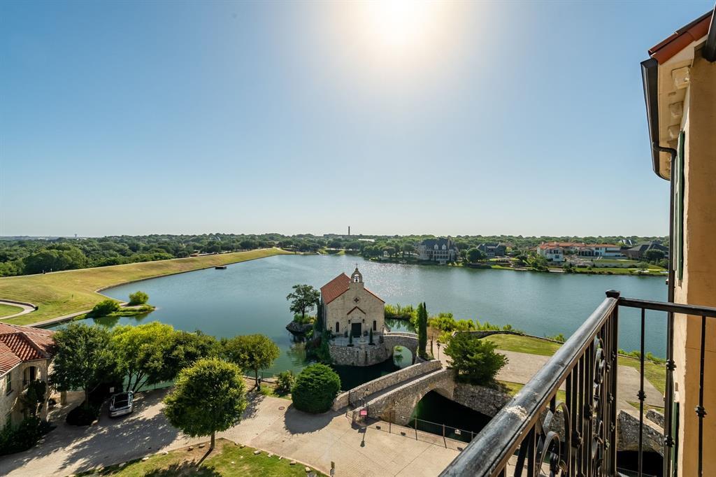 Luxury corner adjacent penthouse in Adriatica Village with breathtaking lake views and spectacular sunsets over the iconic bell tower. Features soaring 12ft ceilings, gourmet Wolf gas stove, Sub Zero refrigerator and freezer, wine fridge, granite counters, custom cabinetry, elegant crown molding, travertine and rich wood floors, and a spa like master retreat with a Jacuzzi tub. Enjoy lively weddings, professional photo shoots, kayaking, and family picnics on the lake with this all visible from your private balcony. Includes two reserved covered parking spaces and secure private storage. Walk to unique dining, boutique shops, charming coffee shops, and scenic hike&bike trails This is penthouse living at its finest with what my be the best views in Collin County